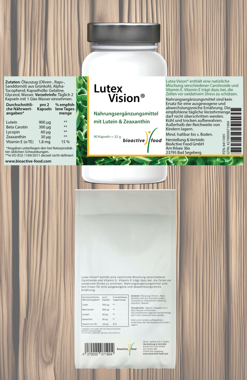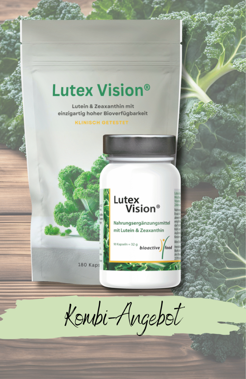 Grünkohlextrakt mit viel Lutein – das weltweit erste Präparat, das ohne organische Lösungsmittel extrahiert worden ist. Neue Studien zeigen, dass Lutein, Zeaxanthin und andere Carotinoide gut vom Körper aufgenommen werden können, wenn sie bereits in Pflanzenöl gelöst sind (Arnold et al., 2014). 2 Kapseln pro Tag liefern 900 µg Lutein, 300 µg Beta-Carotin, 60 µg Lycopin und 30 µg Zeaxanthin.